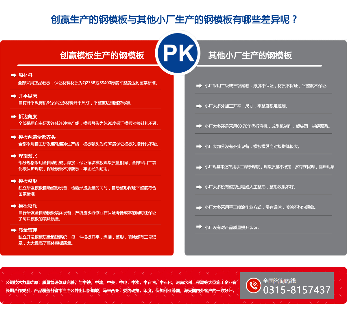 唐山創(chuàng)贏模板有限公司(原唐山豐南雙贏金屬結(jié)構(gòu)廠)始建于一九九七年,是具規(guī)模實(shí)力的組合模板生產(chǎn)企業(yè)。公司技術(shù)力量雄厚,質(zhì)量管理體系完善,與中鐵,中建,中交,中電,中水,中石油,中石化,河南水利工程局等大型施工企業(yè)有長(zhǎng)期合作關(guān)系,產(chǎn)品覆蓋各省市自治區(qū)并出口新加坡,馬來(lái)西亞,委內(nèi)瑞拉,印度,保加利亞等國(guó),深受?chē)?guó)內(nèi)外客戶的一致好評(píng)。